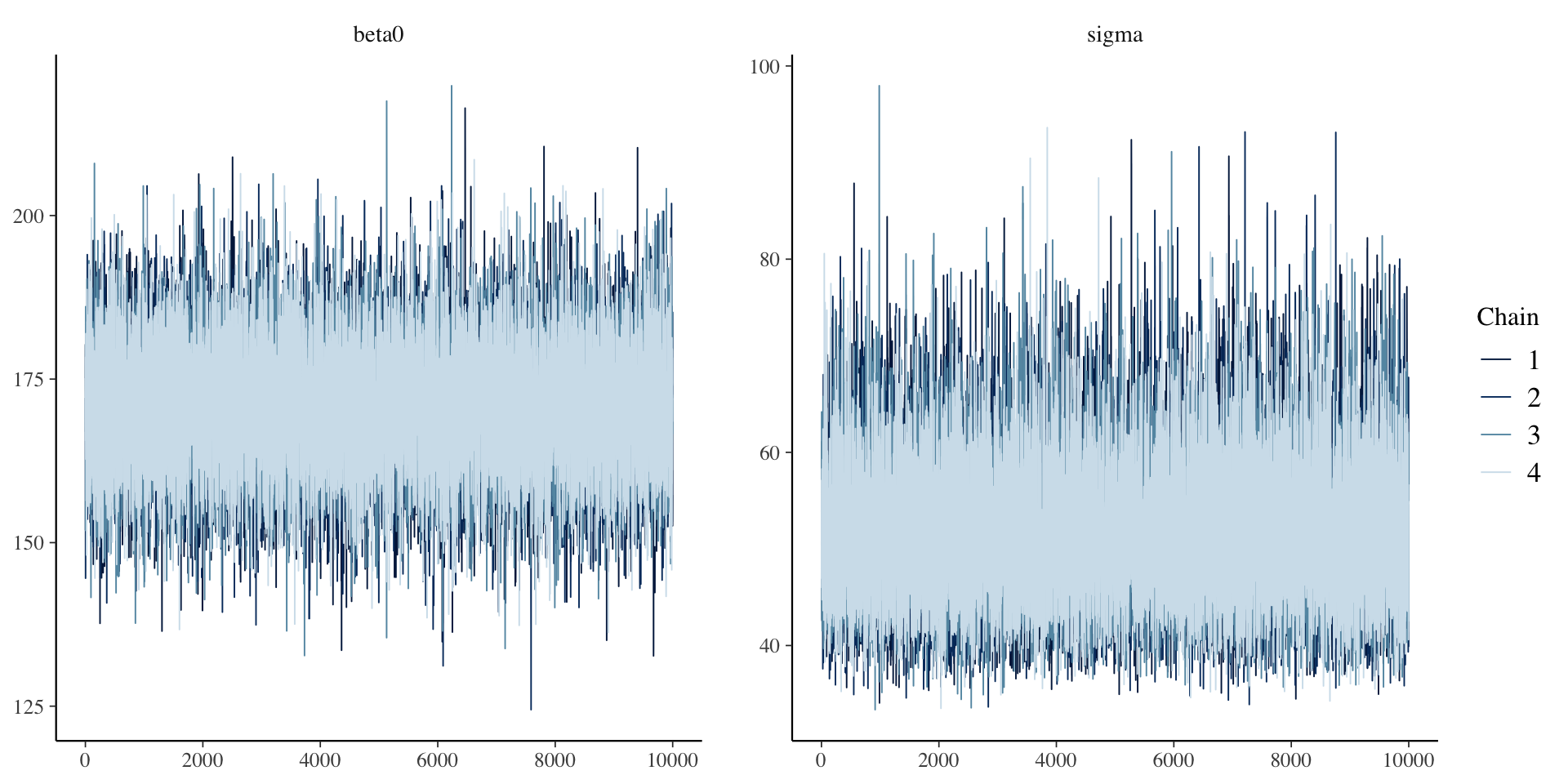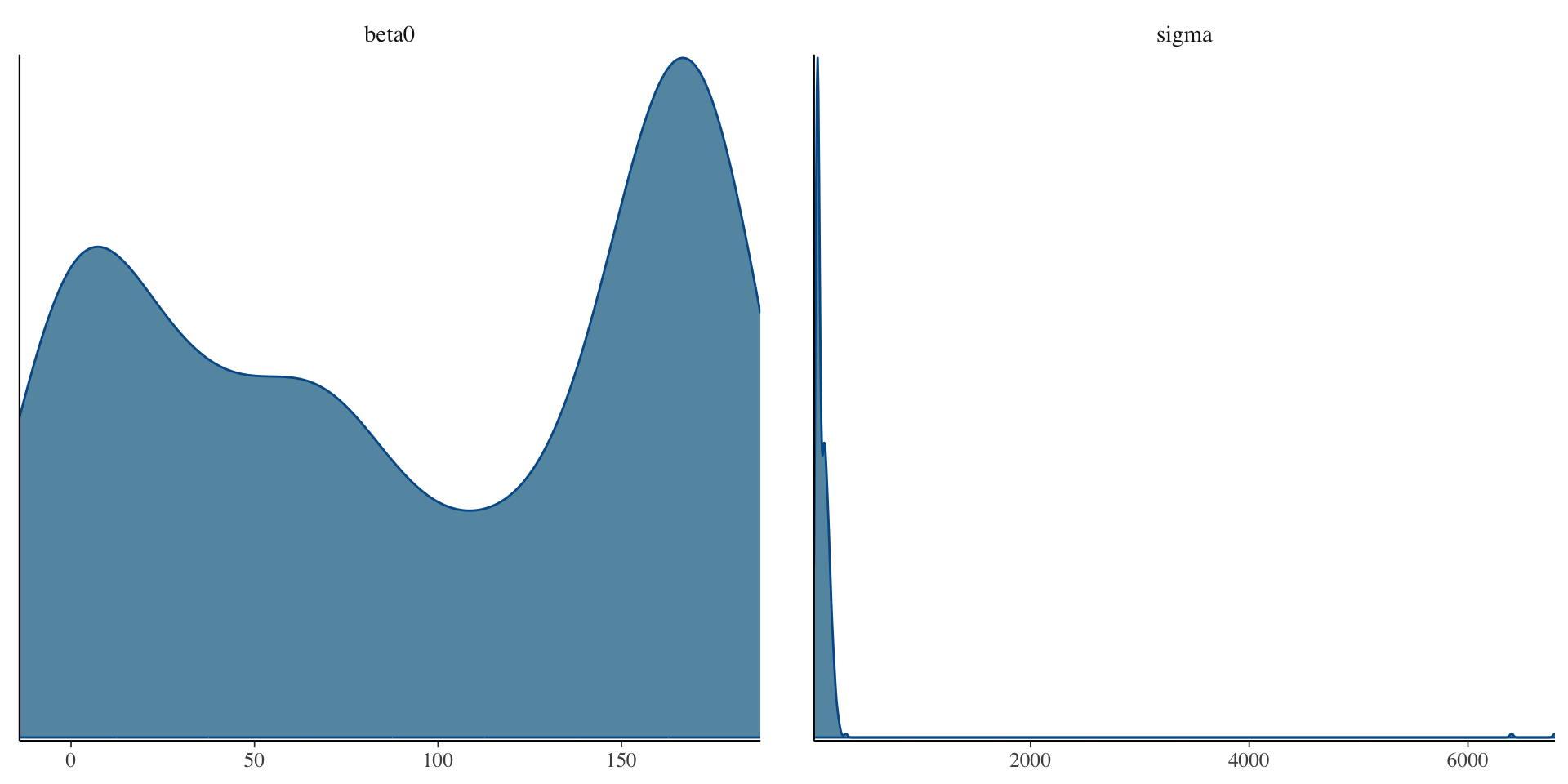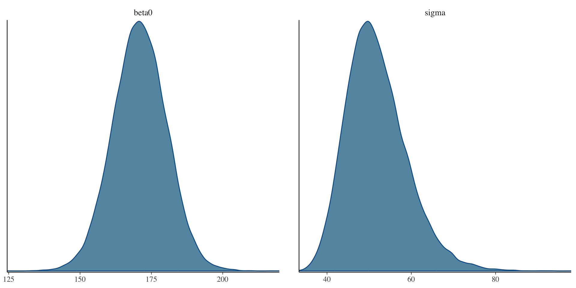 y ~ normal(beta0, sigma); // model for observed datasigma ~ uniform(0, 100000); // prior for sigmaSee: https://mc-stan.org/docs/functions-reference/index.html for more information