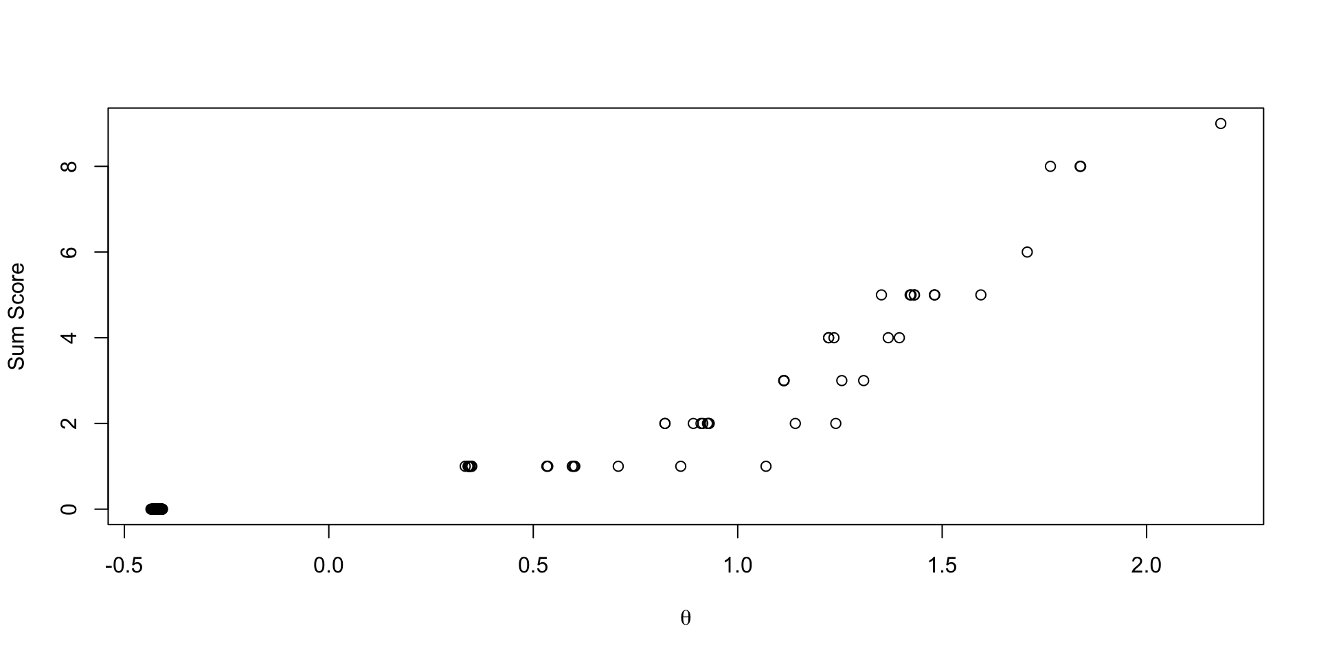 \[TCC(\theta) = \sum_{i=1}^I \frac{\exp \left(a_i \left(\theta -b_i \right) \right)}{1+ \exp \left(a_i \left(\theta-b_i \right) \right)}\]