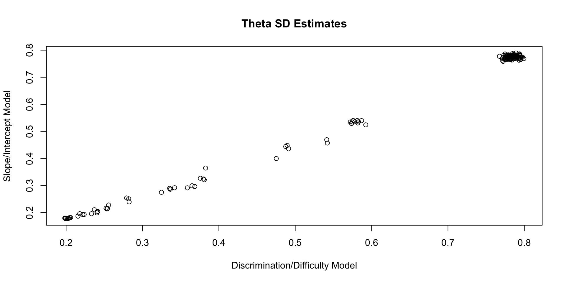 Shown for the discrimination/difficulty parameterization (but applies to slope/intercept, too)