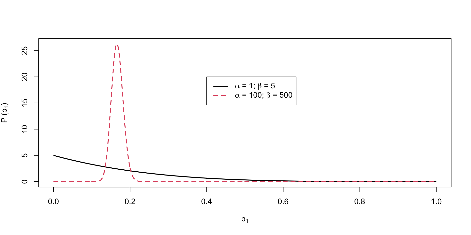 \[P(p_1) = \frac{\left( p_1\right)^{\alpha-1} \left(1-p_1 \right)^{\beta1-1}}{B\left(\alpha, \beta\right)}, \]
