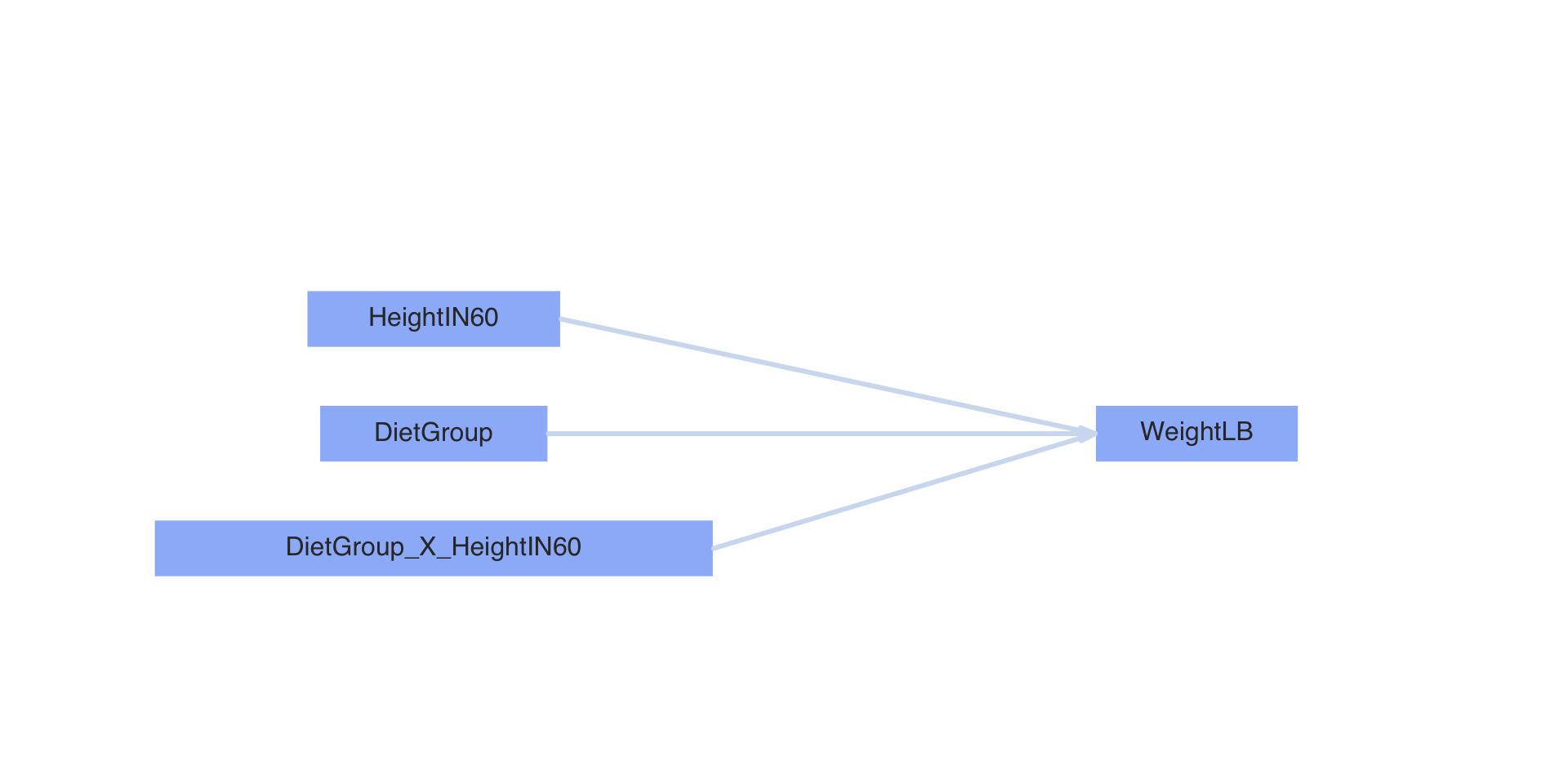 Here, \(\beta_1\) is the change in \(\text{WeightLB}_p\) per one-unit change in \(\text{HeightIN}_p\) for a person in Diet Group 1 (i.e. _p and \(\text{Group3}_p=0\))