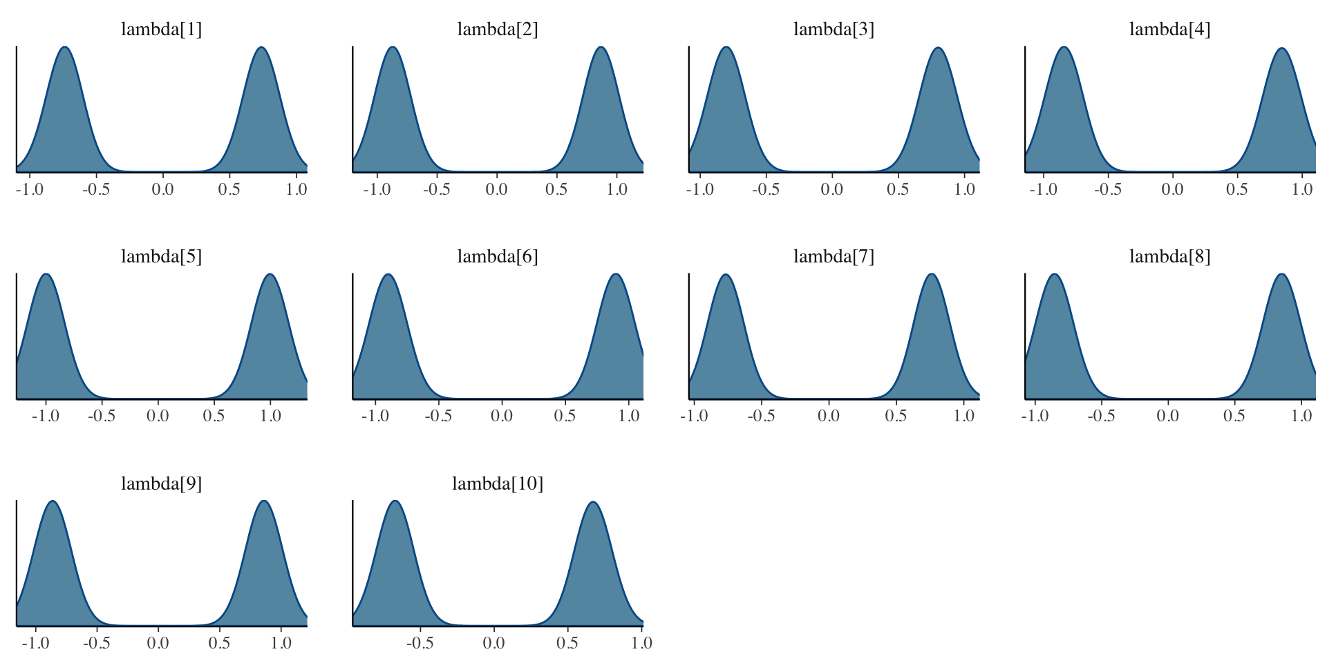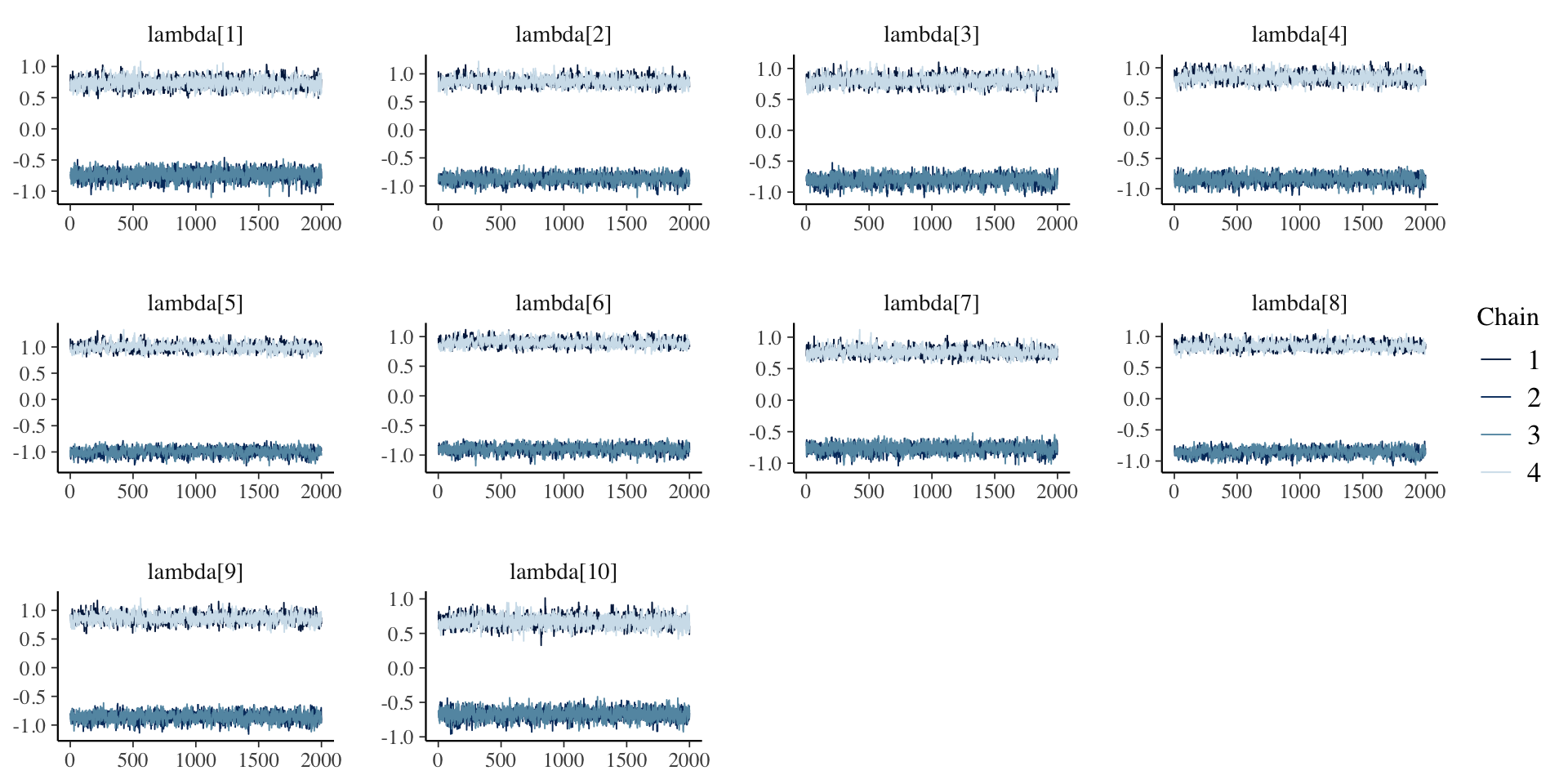 # set starting values for some of the parametersmodelCFA_samples2fixed = modelCFA_stan$sample(data = modelCFA_data,seed =25102022,chains =4,parallel_chains =4,iter_warmup =2000,iter_sampling =2000, init =function() list(lambda=rnorm(nItems, mean=10, sd=2)))