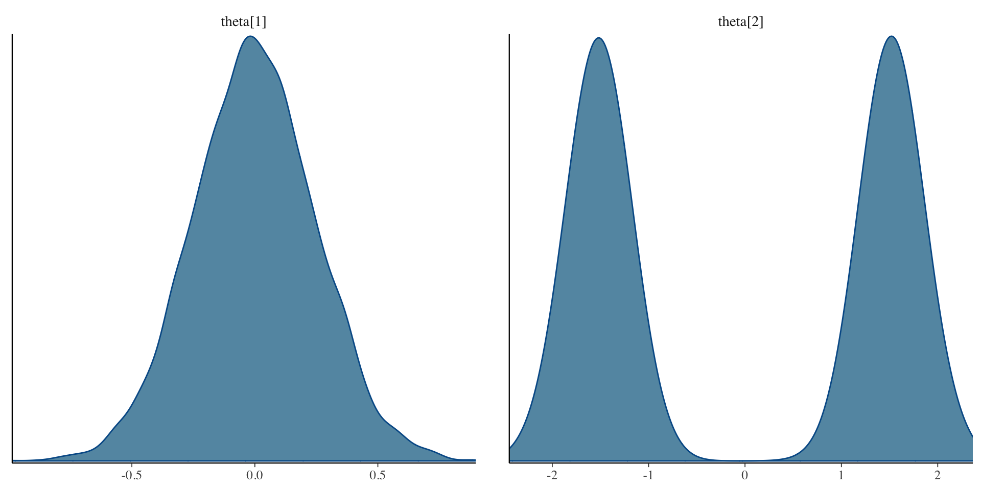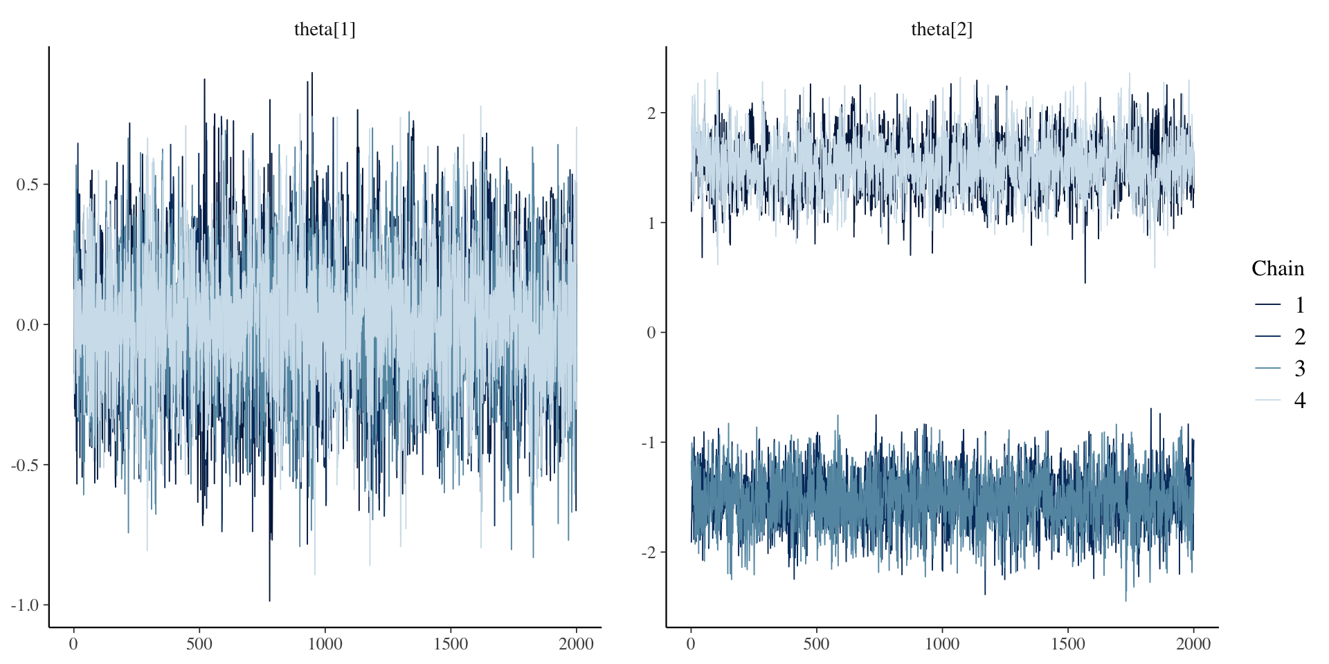 Depending on the random starting values of each of these parameters (per chain), a given chain may converge to a different region