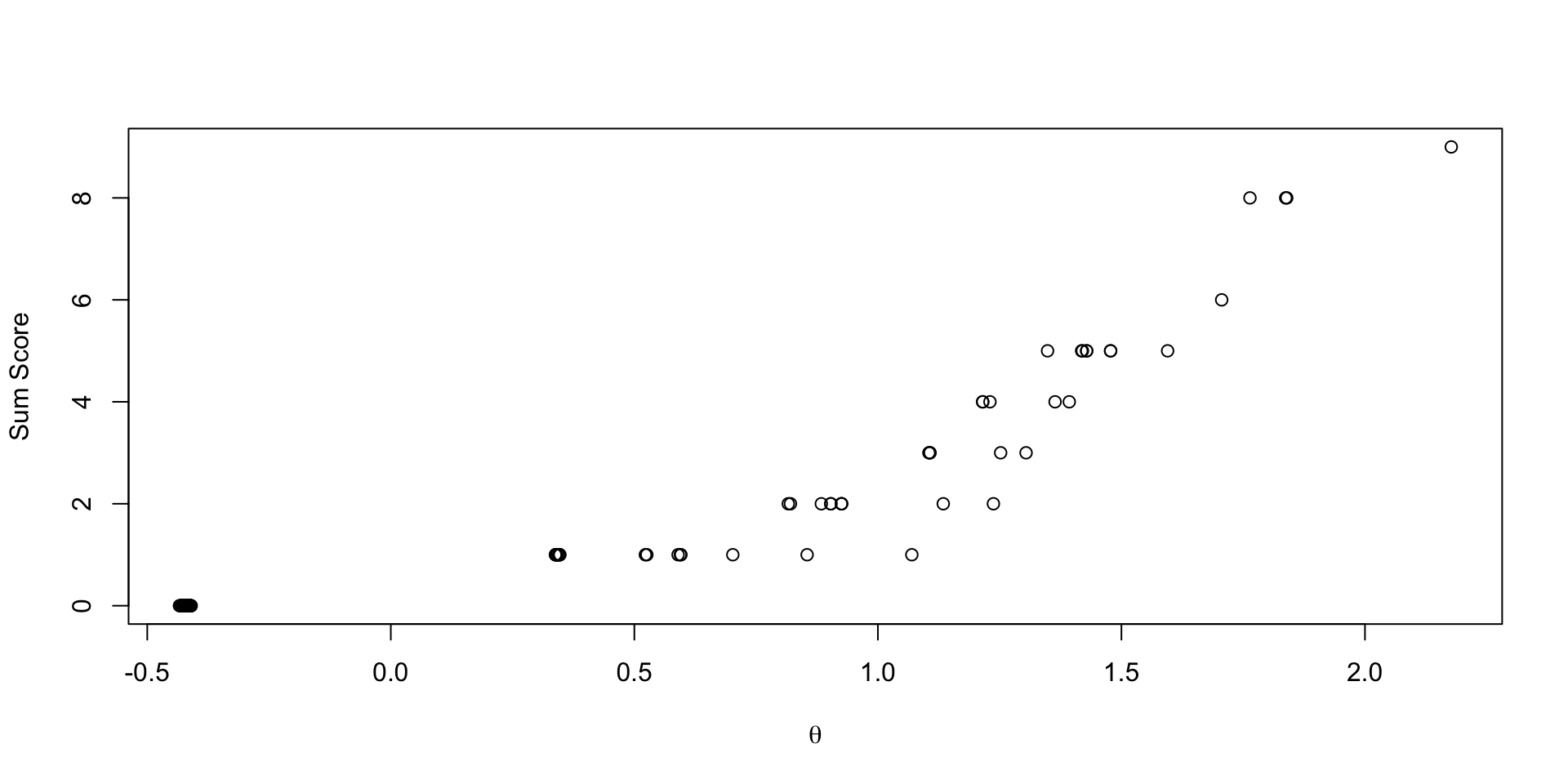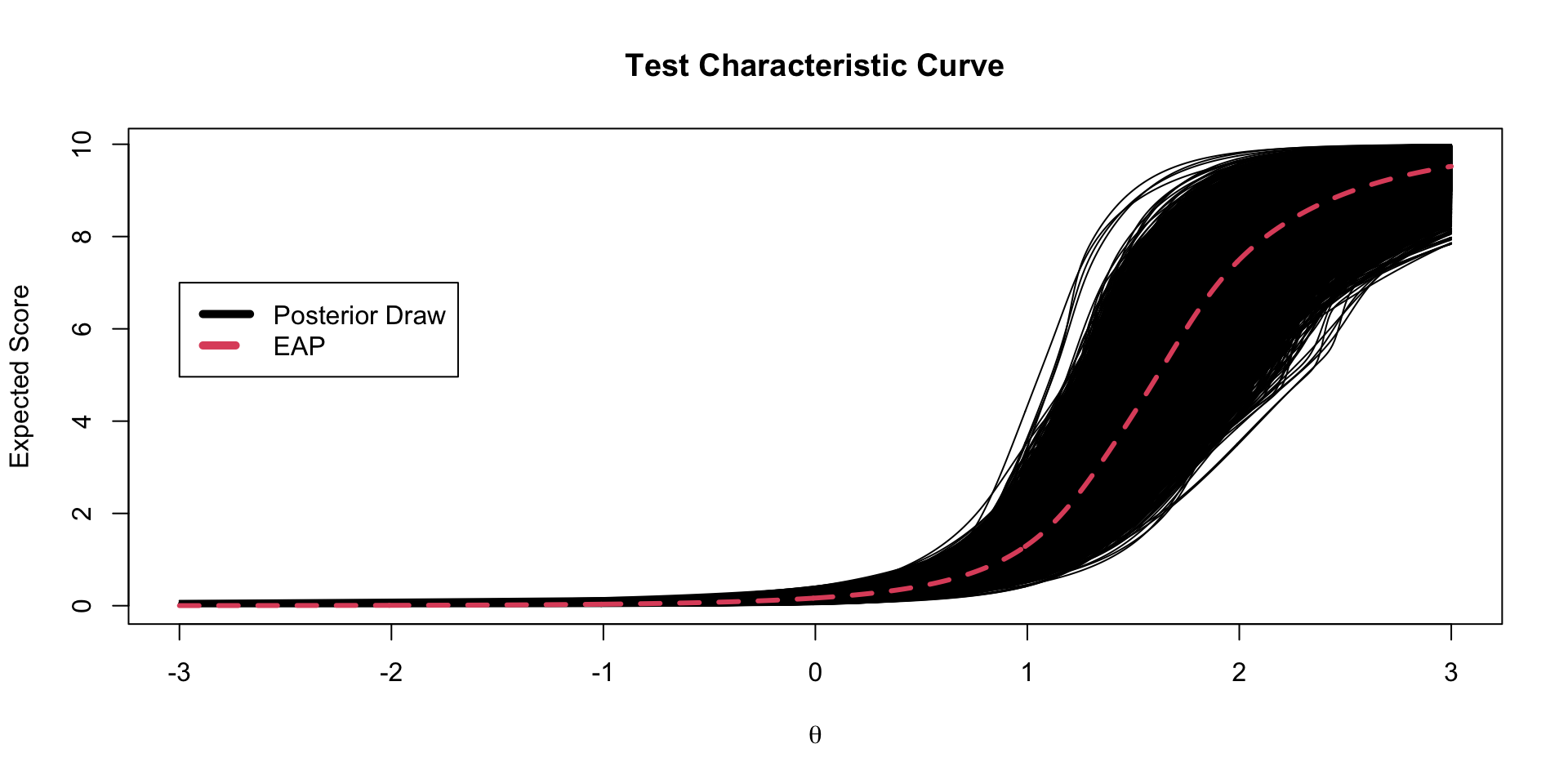 \[TCC(\theta) = \sum_{i=1}^I \frac{\exp \left(a_i \left(\theta -b_i \right) \right)}{1+ \exp \left(a_i \left(\theta-b_i \right) \right)}\]