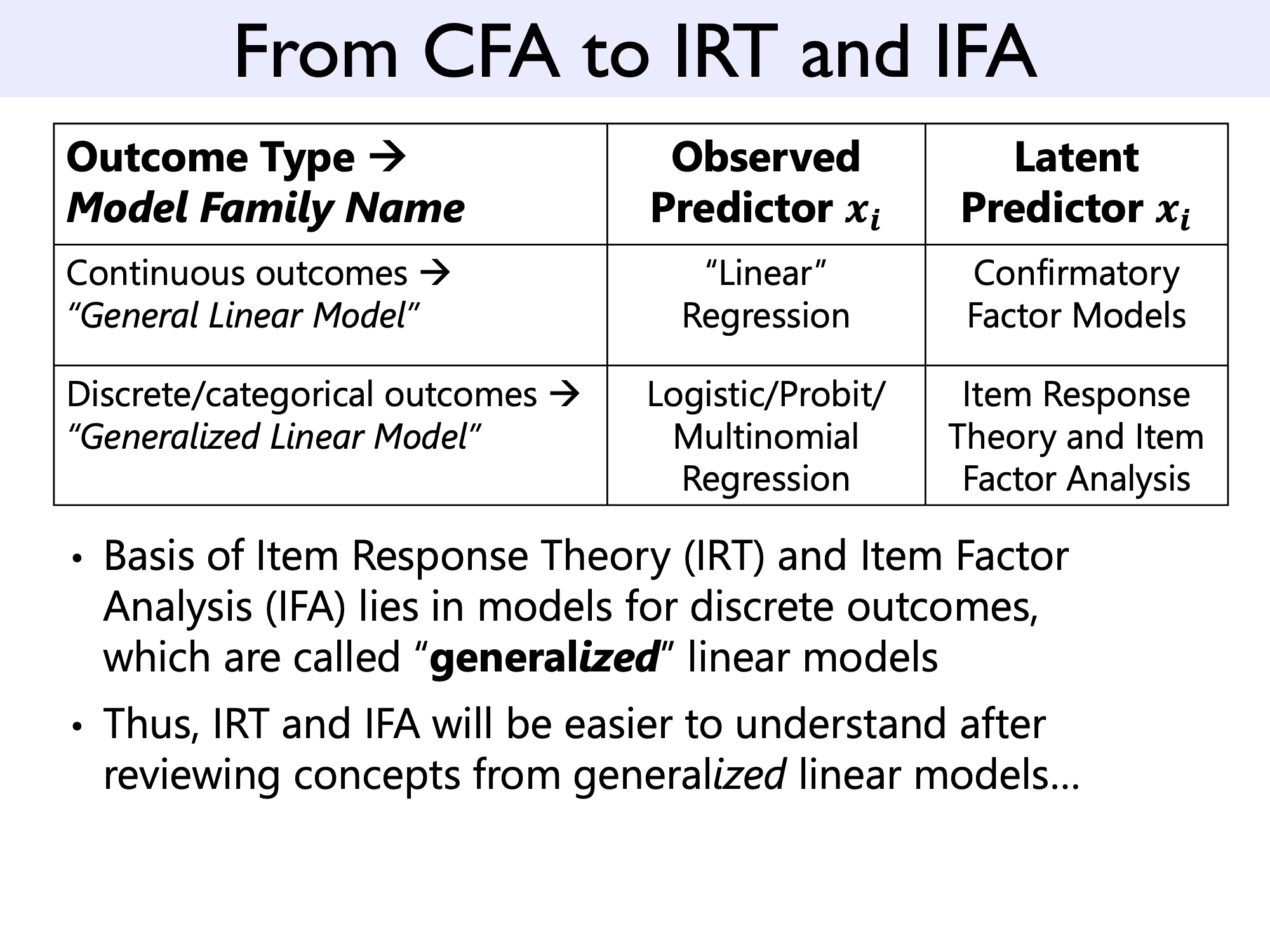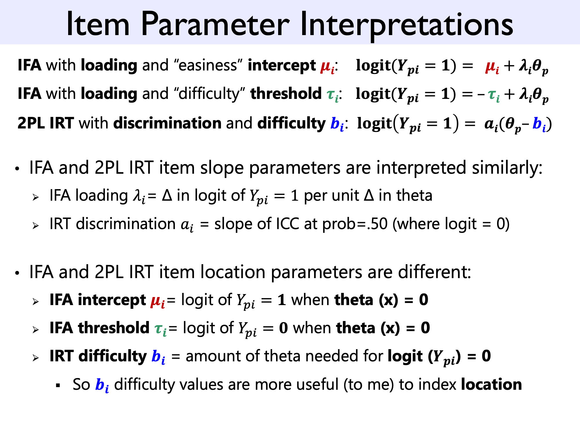 - IFA and IRT are equivalent models—their parameters are transformations of each other: \[