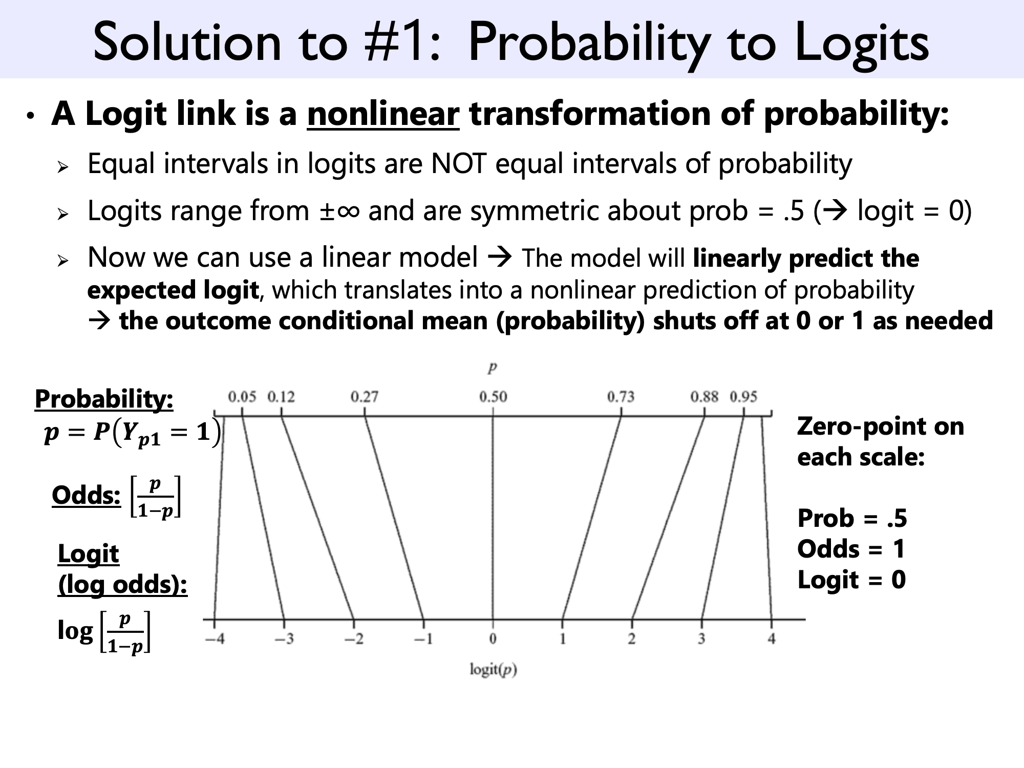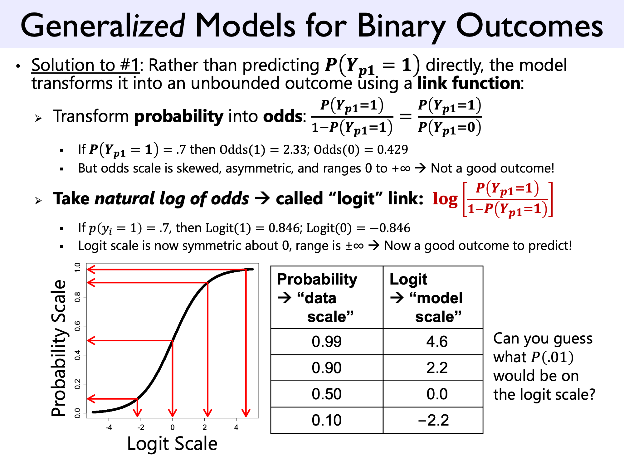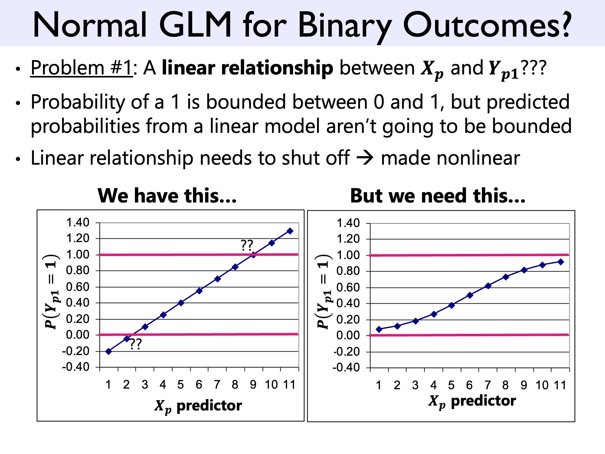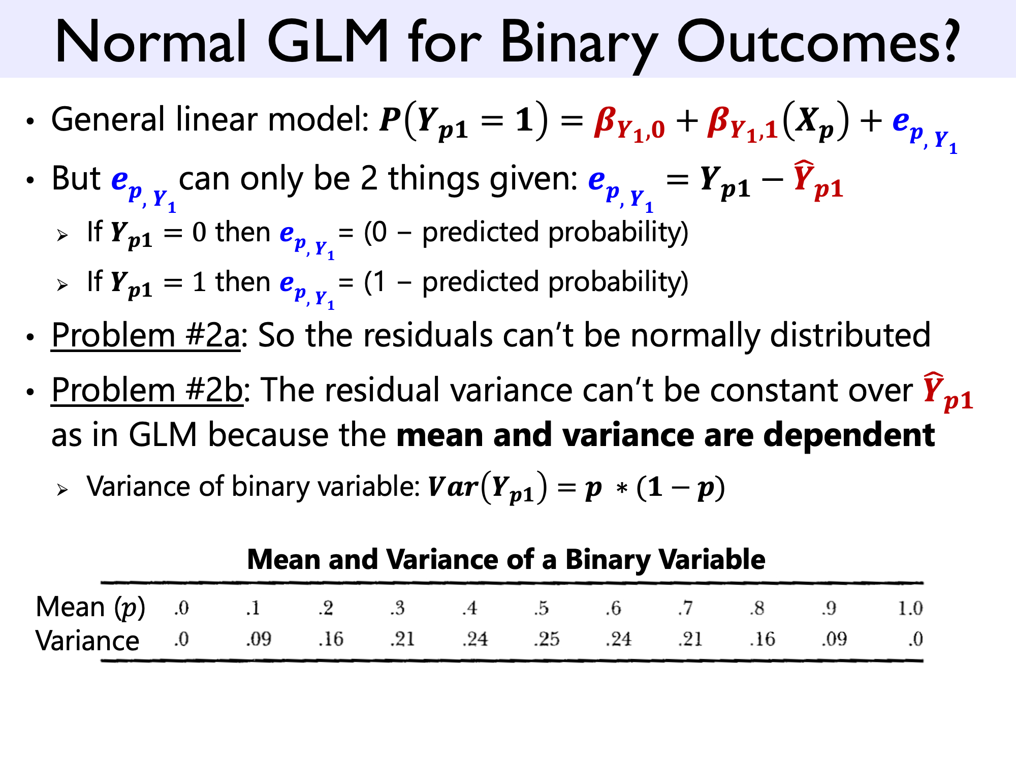 - Using logistic regression for binary outcomes makes the assumption that the outcome follows a (conditional) Bernoulli distribution, or \(Y \sim B(p_Y)\)