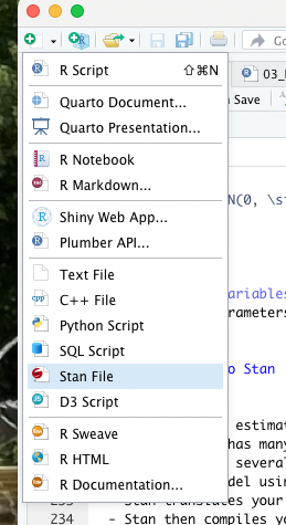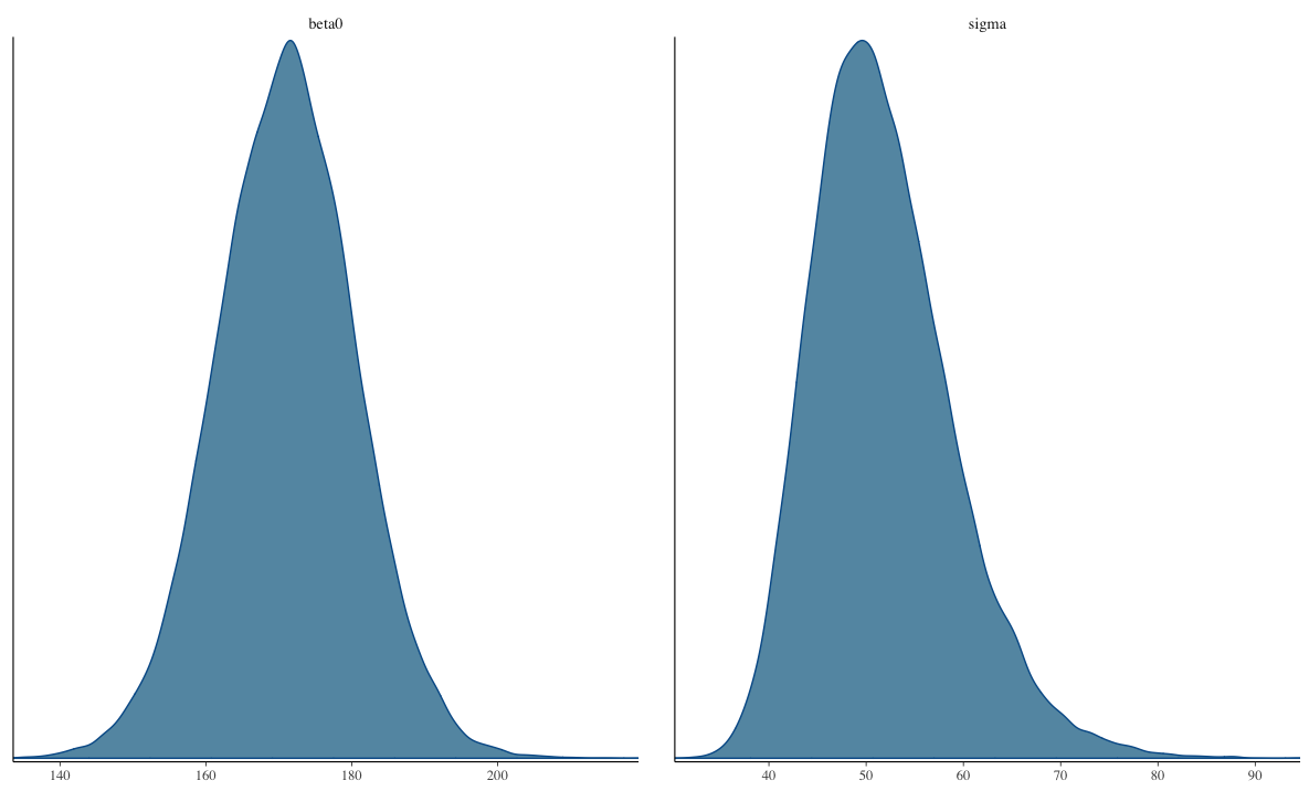 y ~ normal(beta0, sigma); // model for observed datasigma ~ uniform(0, 100000); // prior for sigmaSee: https://mc-stan.org/docs/functions-reference/index.html for more information