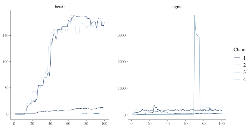 cmdstanr wants you to compile first, then run the Markov chainrstan conducts compilation (if needed) then runs the Markov chainN and a vector named ycmdstanr and rstancmdstanrcmdstanr, running the chain comes from the $sample() function that is a part of the compiled program objectNext, we must determine if the chains converged to their posterior distribution